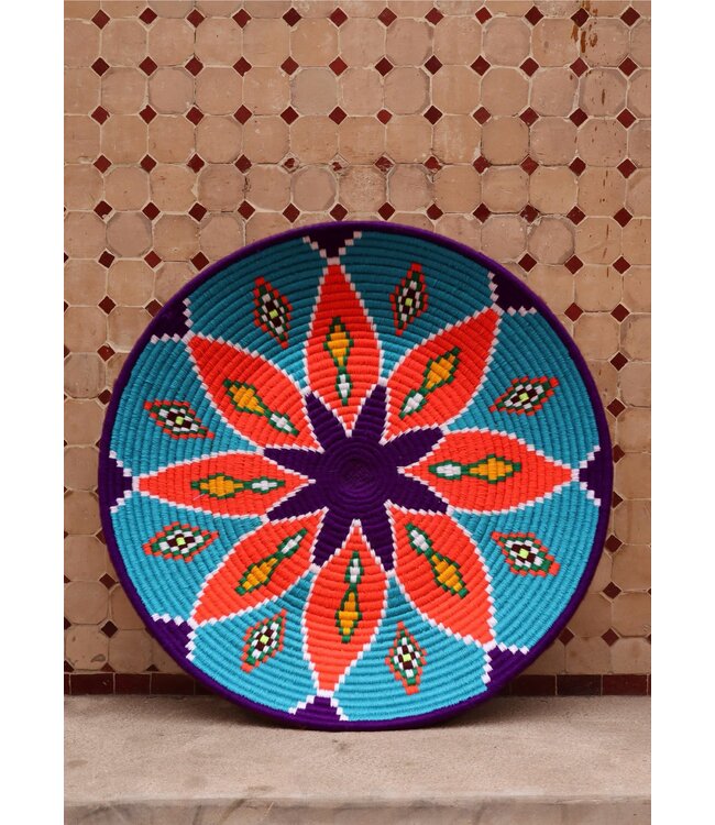 De wollen schalen zijn met de hand vervaardigd in het noorden van Marokko. Elke schaal krijgt een eigen patroon en kleur welke met wol op de schaal wordt geweven. Een eyecather voor aan de muur of gebruik ze bijvoorbeeld als fruit- of broodschaal. Van elke schaal is er slechts één stuk verkrijgbaar en is daardoor uniek in zijn soort!