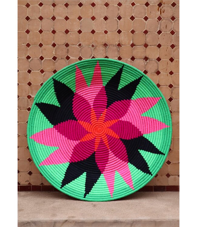 De wollen schalen zijn met de hand vervaardigd in het noorden van Marokko. Elke schaal krijgt een eigen patroon en kleur welke met wol op de schaal wordt geweven. Een eyecather voor aan de muur of gebruik ze bijvoorbeeld als fruit- of broodschaal. Van elke schaal is er slechts één stuk verkrijgbaar en is daardoor uniek in zijn soort!