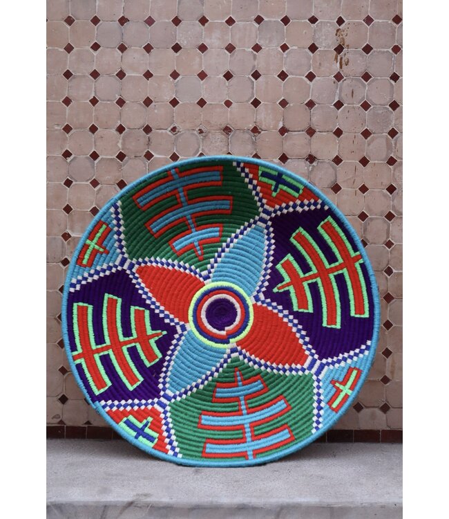 De wollen schalen zijn met de hand vervaardigd in het noorden van Marokko. Elke schaal krijgt een eigen patroon en kleur welke met wol op de schaal wordt geweven. Een eyecather voor aan de muur of gebruik ze bijvoorbeeld als fruit- of broodschaal. Van elke schaal is er slechts één stuk verkrijgbaar en is daardoor uniek in zijn soort!