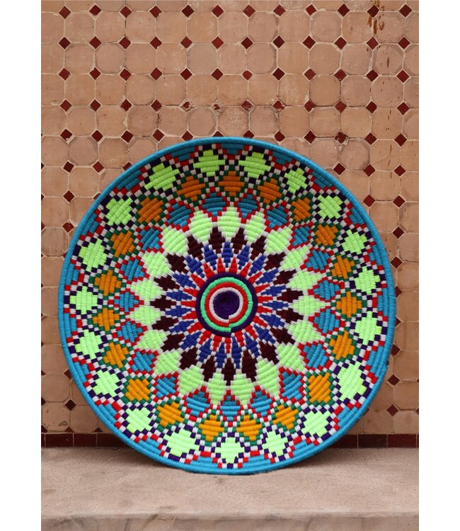 De wollen schalen zijn met de hand vervaardigd in het noorden van Marokko. Elke schaal krijgt een eigen patroon en kleur welke met wol op de schaal wordt geweven. Een eyecather voor aan de muur of gebruik ze bijvoorbeeld als fruit- of broodschaal. Van elke schaal is er slechts één stuk verkrijgbaar en is daardoor uniek in zijn soort!