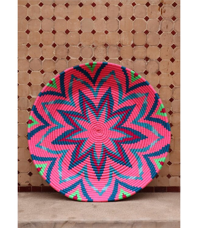 De wollen schalen zijn met de hand vervaardigd in het noorden van Marokko. Elke schaal krijgt een eigen patroon en kleur welke met wol op de schaal wordt geweven. Een eyecather voor aan de muur of gebruik ze bijvoorbeeld als fruit- of broodschaal. Van elke schaal is er slechts één stuk verkrijgbaar en is daardoor uniek in zijn soort!