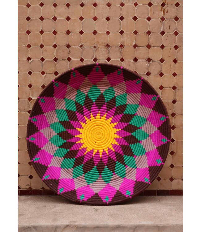 De wollen schalen zijn met de hand vervaardigd in het noorden van Marokko. Elke schaal krijgt een eigen patroon en kleur welke met wol op de schaal wordt geweven. Een eyecather voor aan de muur of gebruik ze bijvoorbeeld als fruit- of broodschaal. Van elke schaal is er slechts één stuk verkrijgbaar en is daardoor uniek in zijn soort!