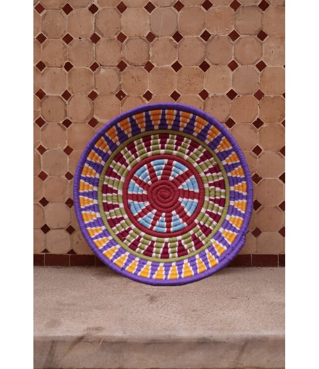 De wollen schalen zijn met de hand vervaardigd in het noorden van Marokko. Elke schaal krijgt een eigen patroon en kleur welke met wol op de schaal wordt geweven. Een eyecather voor aan de muur of gebruik ze bijvoorbeeld als fruit- of broodschaal. Van elke schaal is er slechts één stuk verkrijgbaar en is daardoor uniek in zijn soort!