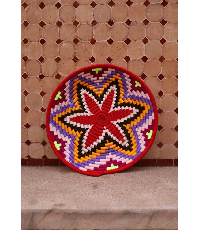 De wollen schalen zijn met de hand vervaardigd in het noorden van Marokko. Elke schaal krijgt een eigen patroon en kleur welke met wol op de schaal wordt geweven. Een eyecather voor aan de muur of gebruik ze bijvoorbeeld als fruit- of broodschaal. Van elke schaal is er slechts één stuk verkrijgbaar en is daardoor uniek in zijn soort!