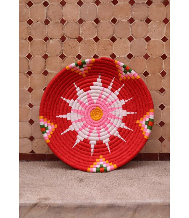 De wollen schalen zijn met de hand vervaardigd in het noorden van Marokko. Elke schaal krijgt een eigen patroon en kleur welke met wol op de schaal wordt geweven. Een eyecather voor aan de muur of gebruik ze bijvoorbeeld als fruit- of broodschaal. Van elke schaal is er slechts één stuk verkrijgbaar en is daardoor uniek in zijn soort!