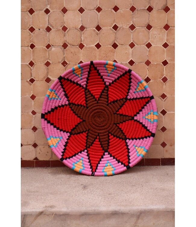 De wollen schalen zijn met de hand vervaardigd in het noorden van Marokko. Elke schaal krijgt een eigen patroon en kleur welke met wol op de schaal wordt geweven. Een eyecather voor aan de muur of gebruik ze bijvoorbeeld als fruit- of broodschaal. Van elke schaal is er slechts één stuk verkrijgbaar en is daardoor uniek in zijn soort!
