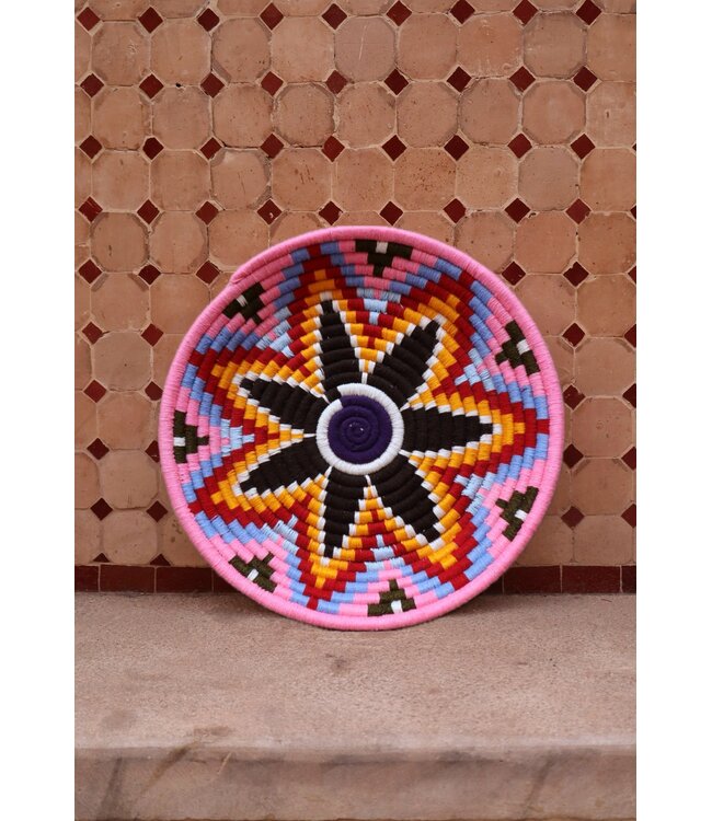 De wollen schalen zijn met de hand vervaardigd in het noorden van Marokko. Elke schaal krijgt een eigen patroon en kleur welke met wol op de schaal wordt geweven. Een eyecather voor aan de muur of gebruik ze bijvoorbeeld als fruit- of broodschaal. Van elke schaal is er slechts één stuk verkrijgbaar en is daardoor uniek in zijn soort!