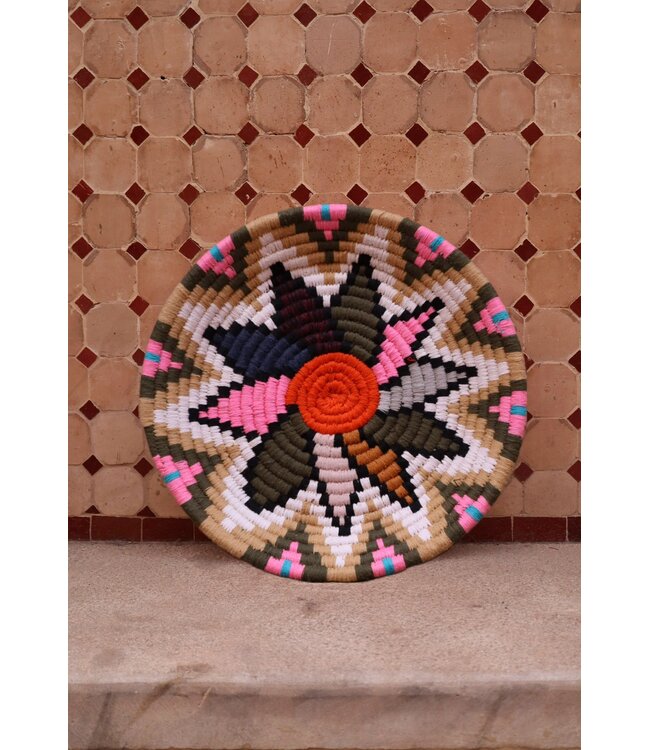 De wollen schalen zijn met de hand vervaardigd in het noorden van Marokko. Elke schaal krijgt een eigen patroon en kleur welke met wol op de schaal wordt geweven. Een eyecather voor aan de muur of gebruik ze bijvoorbeeld als fruit- of broodschaal. Van elke schaal is er slechts één stuk verkrijgbaar en is daardoor uniek in zijn soort!