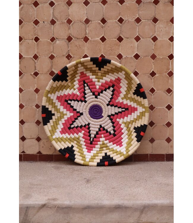 De wollen schalen zijn met de hand vervaardigd in het noorden van Marokko. Elke schaal krijgt een eigen patroon en kleur welke met wol op de schaal wordt geweven. Een eyecather voor aan de muur of gebruik ze bijvoorbeeld als fruit- of broodschaal. Van elke schaal is er slechts één stuk verkrijgbaar en is daardoor uniek in zijn soort!