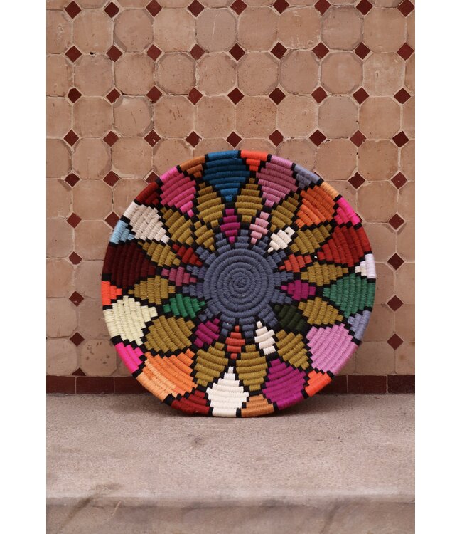 De wollen schalen zijn met de hand vervaardigd in het noorden van Marokko. Elke schaal krijgt een eigen patroon en kleur welke met wol op de schaal wordt geweven. Een eyecather voor aan de muur of gebruik ze bijvoorbeeld als fruit- of broodschaal. Van elke schaal is er slechts één stuk verkrijgbaar en is daardoor uniek in zijn soort!